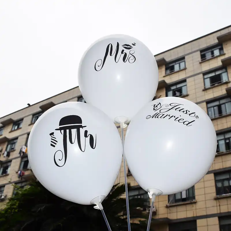 New 10 Pcs Round White Print Mr Mrs Just Married Wedding Latex Balloon Love Engagement Hen Wedding Decoration Party Supplies Party Diy Decorations Aliexpress from ae01.alicdn.com Wedding table setting decorated in rustic style. Balloons are often hung from the ceiling at wedding receptions. Wedding balloon decorations wedding balloons birthday party decorations wedding diy church pew decorations wedding chair decor.